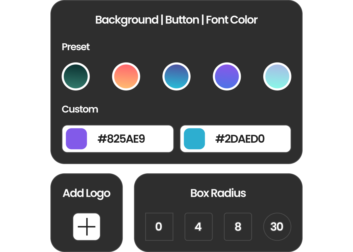 From background colour, to button and font colour and even customised logo animation to elevate your personal/company branding to the next level